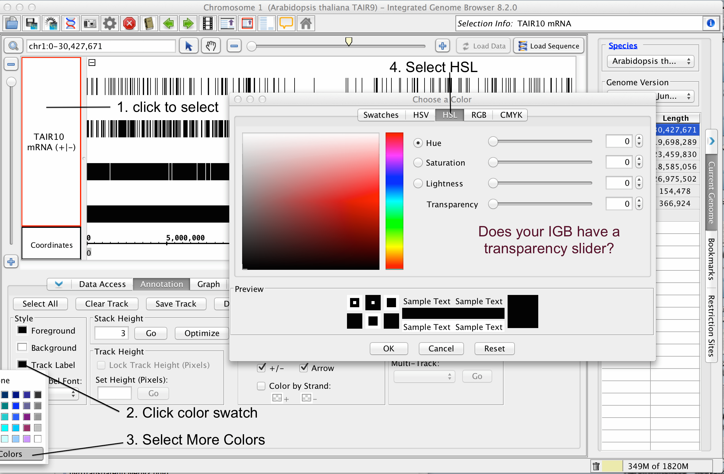 mason Mason Meyer (Inactive) added a comment - From: <Loraine>, Ann <Ann.Loraine@uncc.edu> Date: Sunday, December 14, 2014 at 11:00 PM To: Dávid Molnár <zeitgeistmeister@googlemail.com> Cc: "Clabaugh, Ivory" <ieclabau@uncc.edu>, "Norris, David" <dcnorris@uncc.edu>, "Freese, Nowlan" <nfreese@uncc.edu>, Mason Meyer <mason.meyer@my.lr.edu> Subject: Re: Redirect loop at forum link & transparent track colours Hello, Thanks for your message - I hope we can help! I’m wondering if the problem has to do with the Java version? Please take a look at the attached image. If you follow the steps, do you see an “HSL” tab? This image is from a preview version of IGB 8.2, but I don’t think the color choosing functionality has changed between 8.1 and 8.2 releases of IGB. If there’s a difference, it might have to do with the Java version. So you should see the same thing with IGB 8.1. We are planning to release IGB 8.2 some time this week, possibly even on Monday. IGB 8.2 is faster and more user friendly than previous versions - and we added new features, including an option to visualize paired end alignments (from BAM files) as linked. I am also especially excited about the new bridge to R we implemented — it’s very new and we hope people will like it. Some demo code is here: https://bitbucket.org/lorainelab/rtoigb If you’d like to hear more, Nowlan is doing a presentation on-line of the new features on Wednesday - https://www.biostars.org/p/123516/ If you have time to join in, that would be great, but if not, you can view it on YouTube later. Best wishes, Ann