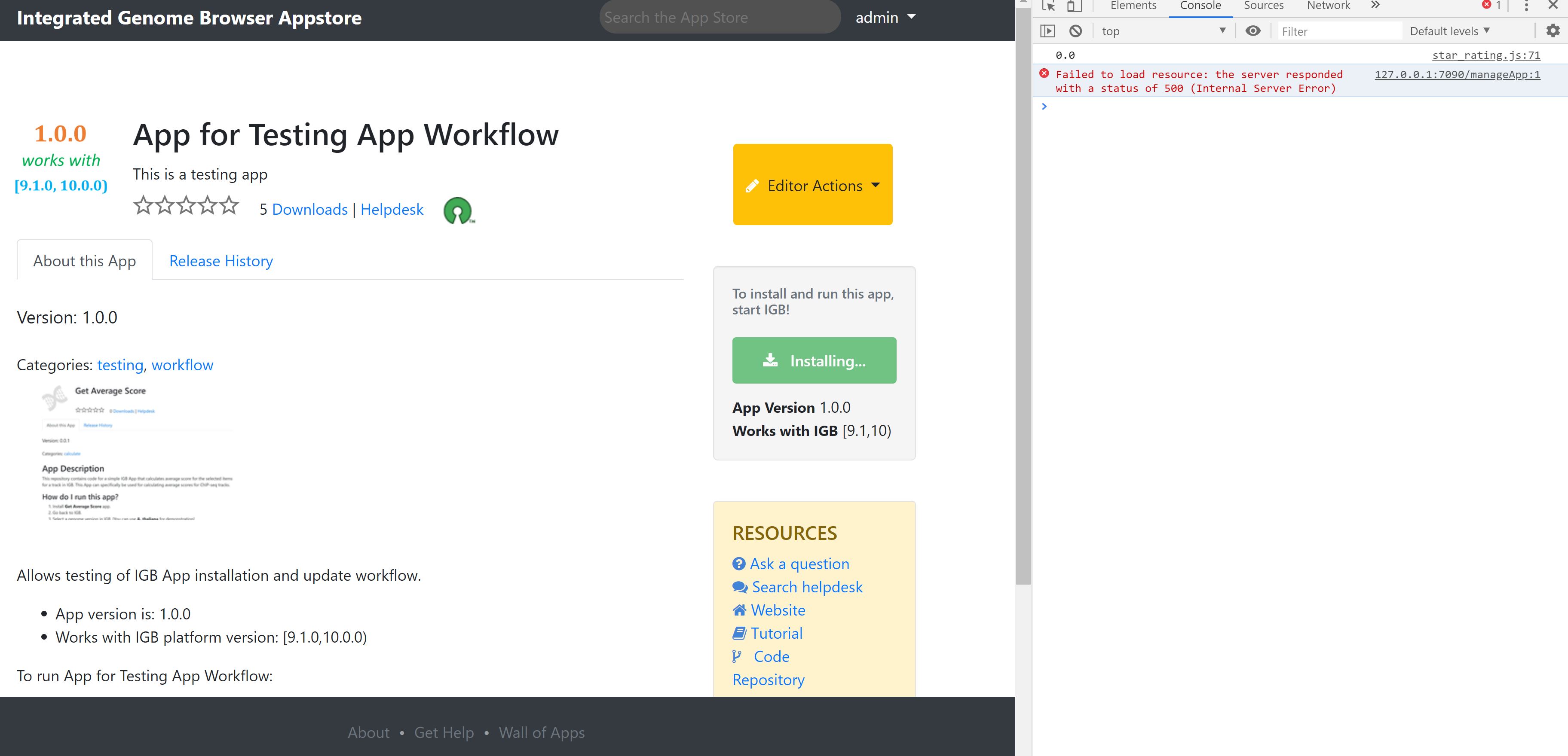 Try releasing an app on Appstore. With IGB running, install the app from appstore by clicking on 'Install this app' button. Ideally, it changes to 'Installing' momentarily and then 'Installed' is displayed. But when there is an error as shown in the screenshot, the 'Installing' button does not change to 'Installed'. We need to refresh the page and then it shows 'Installed', the app gets installed too but the download count does not change.