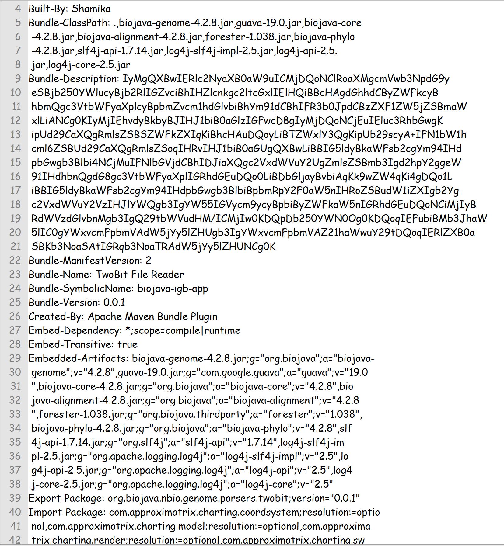 1) When I remove the <Embed-Dependency> tag, the jars which were getting included in the target jar, are not embedded now. The app works fine even without embedding the dependencies separately. I have attached the screenshots for the target jar and manifest in both the cases. Case 1 - when <Embed-Dependency> tag is present, and case 2 - when it has been removed. 2) The errors printed to the console are null-pointer exceptions. These errors occur irrespective of the presence of <Embed-Dependency> tag and are seen whenever this app repository is included in App manager, and continue to appear even after the repo has been removed. My guess is that some events continue to have null values. This will need some digging into. Thank you for pointing it out. 3) I have removed the export statement and the changes are present here: https://bitbucket.org/skulka2710/shamika-2bit-reader/branch/IGBF-2264#diff Should we create a separate ticket for the errors, and its investigation and fix? ] |