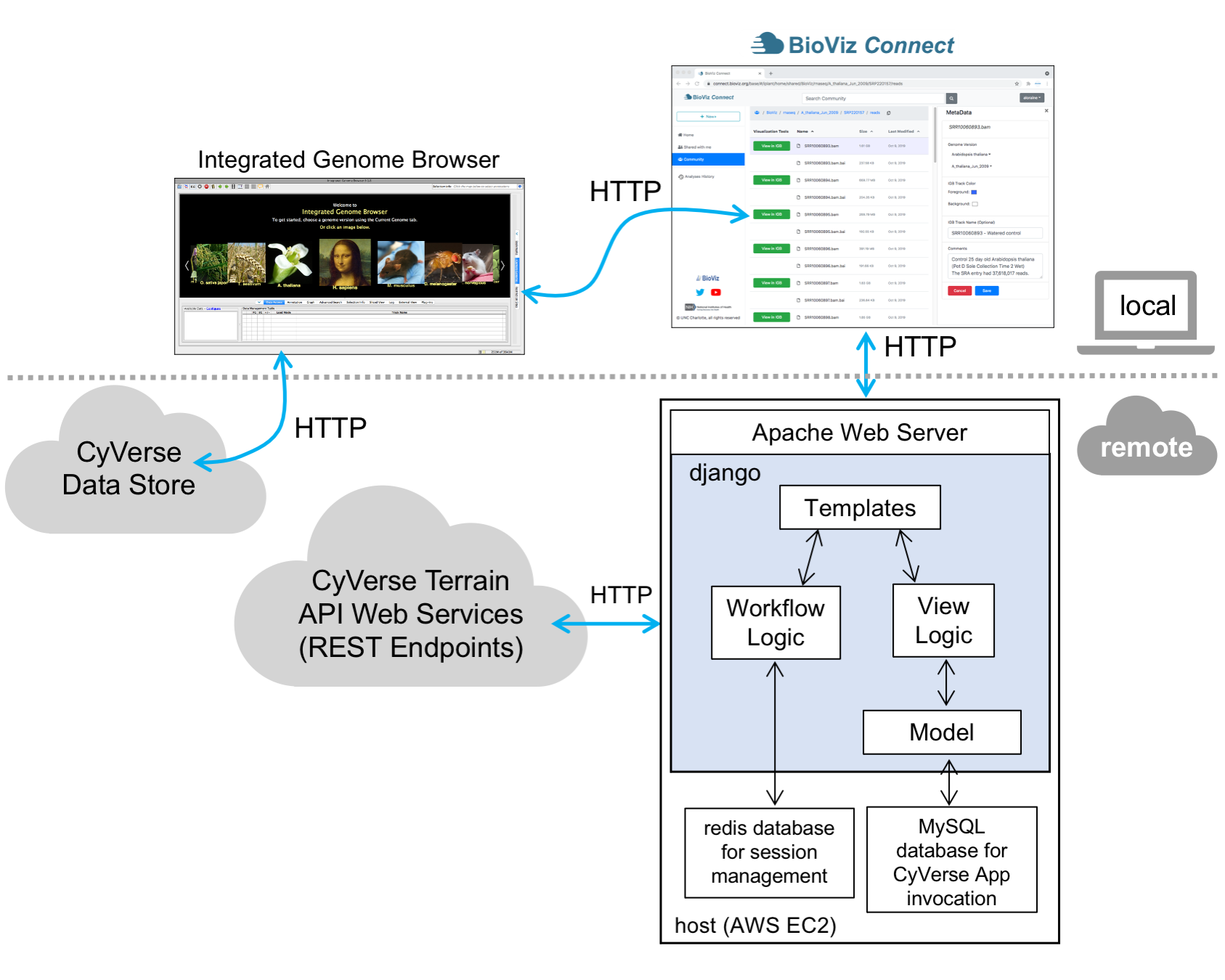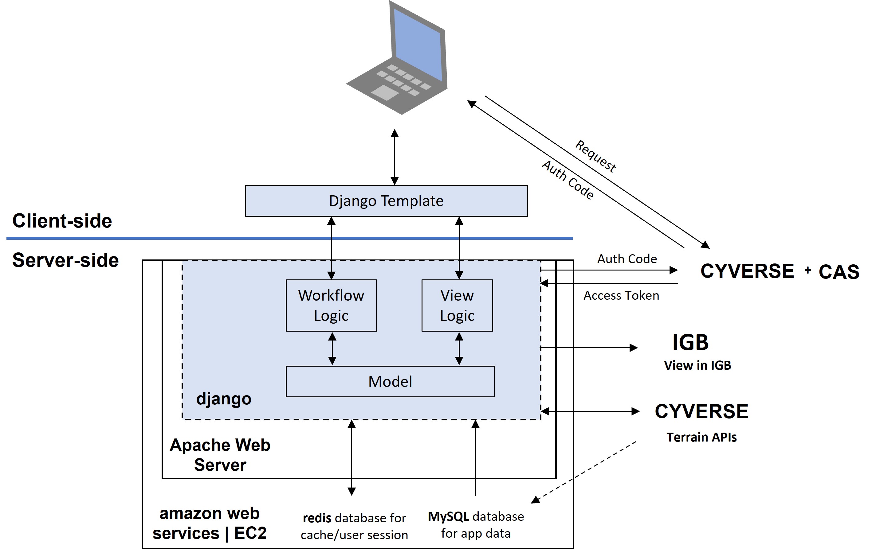 The client / server dividing line is a bit confusing. IGB is show on the server side of the dividing line, which does not make sense to me because IGB is not a client-side program. Similarly, "template" is on the client side of the dividing line, but Django templates are entirely server-side. That's the entire point of them, I thought - they are never exposed to the Web browser.