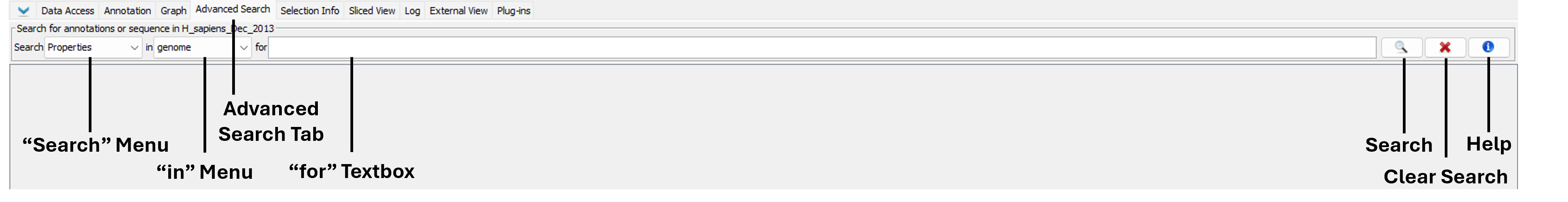 nfreese Nowlan Freese added a comment - The first image is too wide. Make your IGB window smaller when creating images. Add section for "In" menu describing the difference. Also important to point out that search only works if the data are loaded. I.e. if I have loaded my annotation data for chr1 but do a search for a gene on chr2 (assuming chr2 data has not been loaded), then no results will be returned. This has tricked users in the past. Include Properties as a search type. I'm not sure how it is distinguished from other search types, but let's just include it for now and we will figure it out later. The "In" and "For" capitalization is inconsistent. Probably stick with all lowercase to match IGB. This image is too wide. I would move the callouts in this image . The plus/minus callout lines seem to be pointing at the same thing. I think moving the callouts outside of the IGB image would also help them stand out. There's a bit of text towards the bottom "Residues Search Results" that doesn't seem to be part of any section?