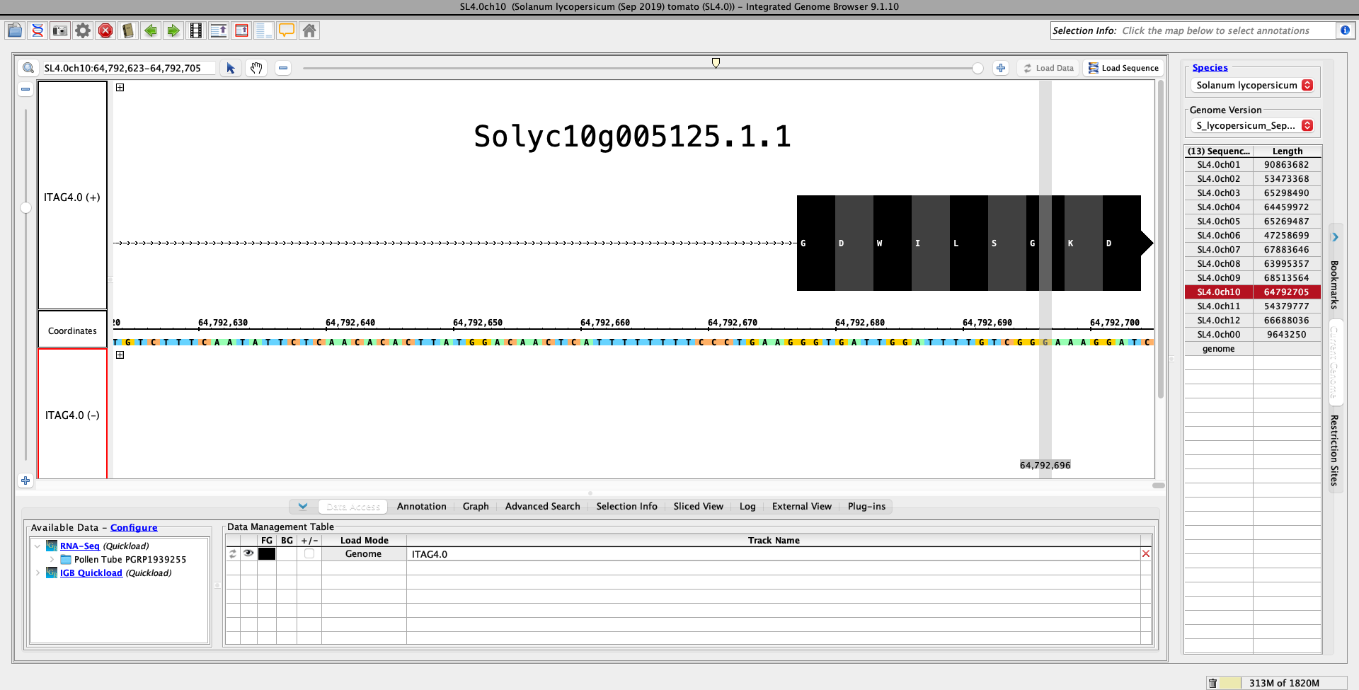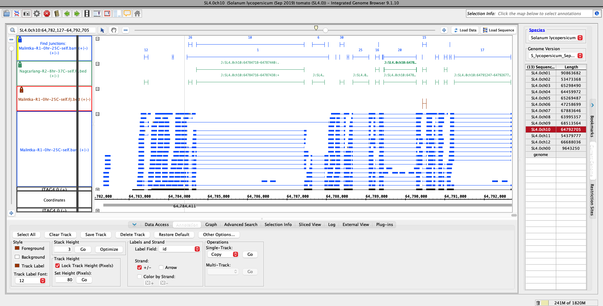 Mdavis4290 Molly Davis added a comment - - edited Files used to visualize error : Proof nothing wrong with bam file : Malintka-R1-0hr-25C-self.bam Needed to view bam in IGB : Malintka-R1-0hr-25C-self.bam.bai Error file : Malintka-R1-0hr-25C-self.FJ.bed.gz Control file : Nagcarlang-R2-8hr-37C-self.FJ.bed.gz Directory: /projects/tomato_genome/fnb/dataprocessing/30-804059537-KP/S_lycopersicum_Sep_2019/results/star_salmon Visualization of the Junction Error in IGB : Issue was seen at end of chromosome 10 SL4. You can see in the red track that a lot of data is missing for the junction file, while in the green the junction file is normal and was processed correctly. End of chromosome 10 :