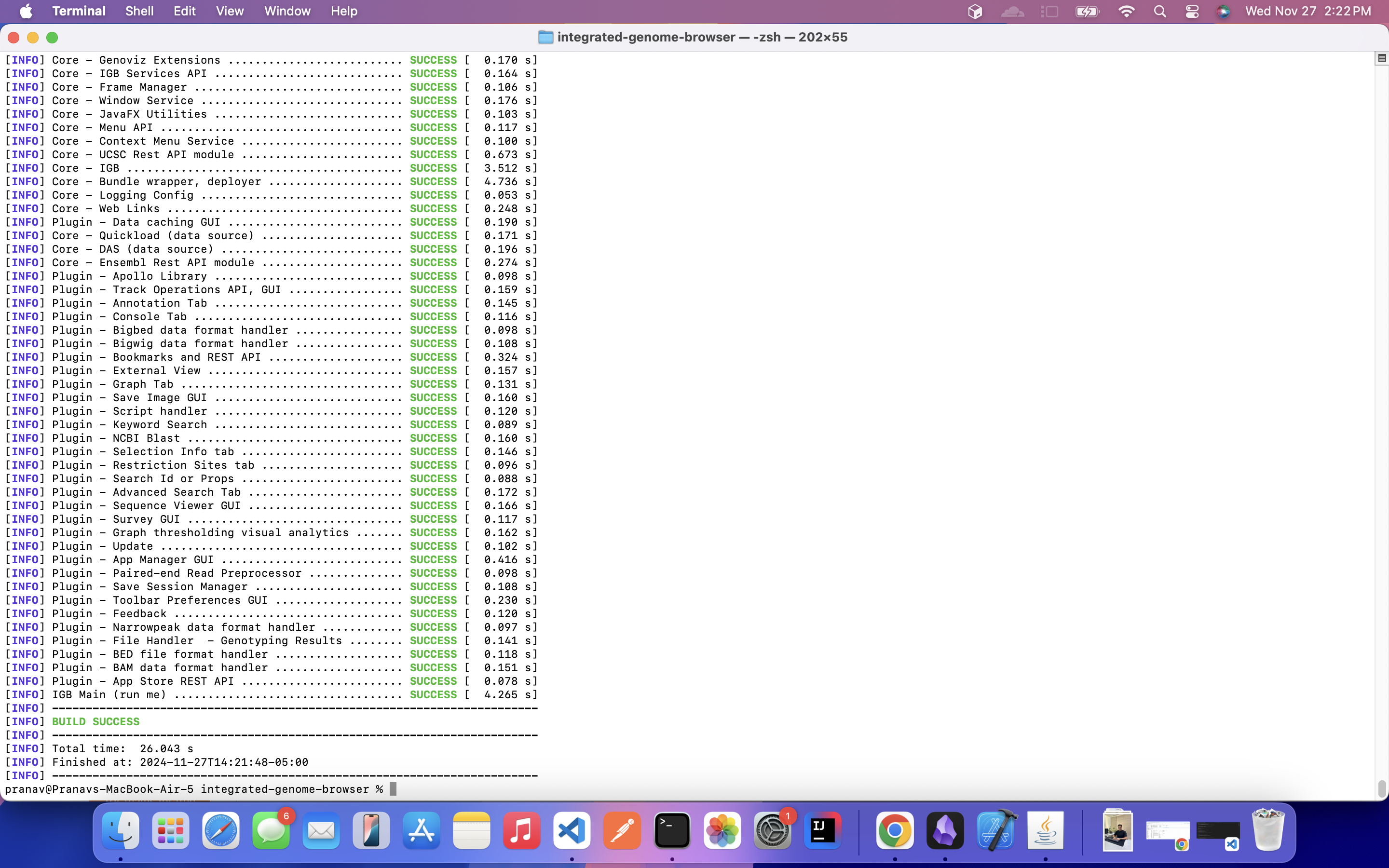 pbhatia1 Pranav Bhatia (Inactive) added a comment - - edited A. Successfully enrolled to IGB 100 (Open source programming with IGB) and completed Module 1 B. Read IGB documentation - 1. About IGB 2. How to test 3. IGB Developers guide C. Successfully downloaded and installed IGB on my local machine and followed the YouTube Video to understand IGB better. Attached is the screenshot of the graph that I got in the end of the video. D. Local environment setup completed - Cloned from personal repository Successfully installed dependencies (Java + Maven) Below is the screenshot attached indicating a successful build. -
