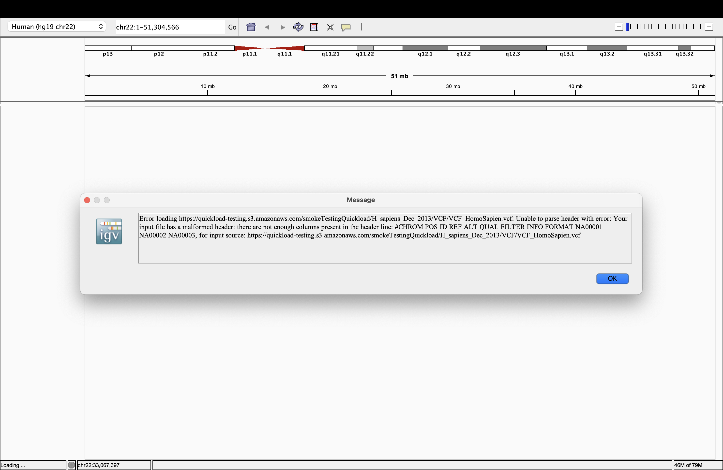 Issue eloboration: New implementation is using VCFFileReader not lineReader, which can process only local files not any kind of URL (http) UPDATE: The issue was with loading VCF file via URL. I do not think the issue was due to the file being part of a Quickload. |