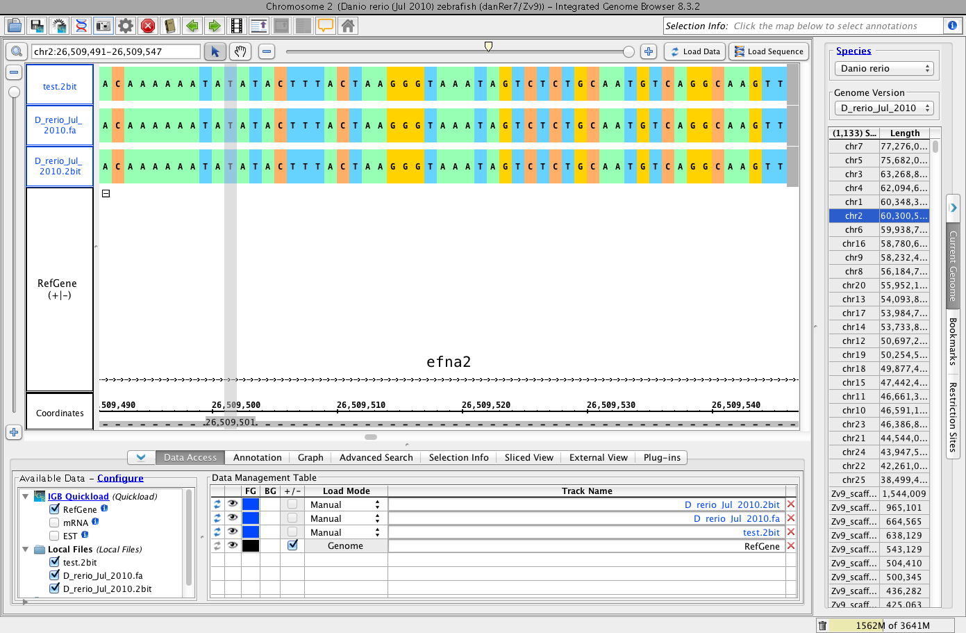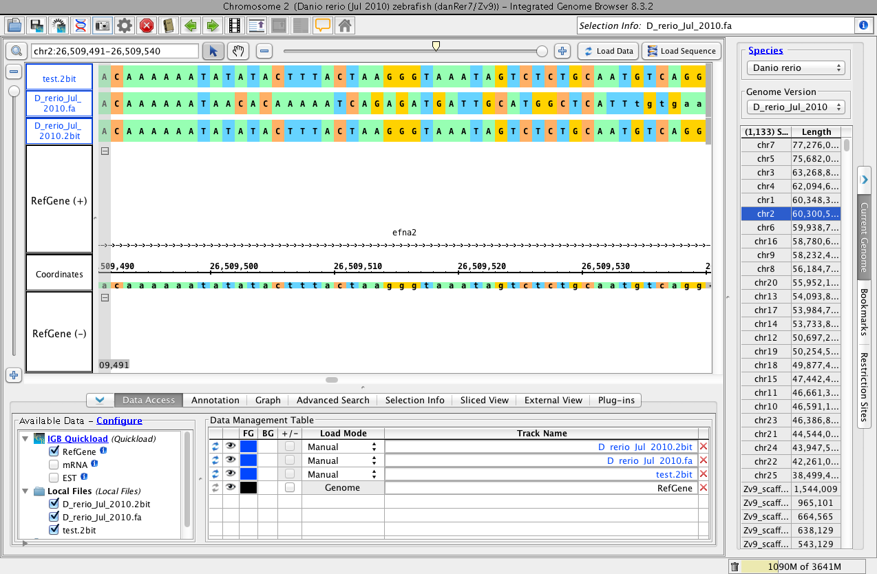 "The files I loaded were from the Zebrafish genome. I took our 2bit file from the Quickload, and converted it into a fasta file. I then took that fasta file and converted it back into a 2bit file (labelled as test.2bit in the image). I loaded the fasta file into IGB, and noticed that the fasta file had a different sequence compared to the reference sequence, though they are technically the same file. When the .2bit and test.2bit files were loaded into IGB alongside the fasta file, the fasta file loaded the sequence correctly."