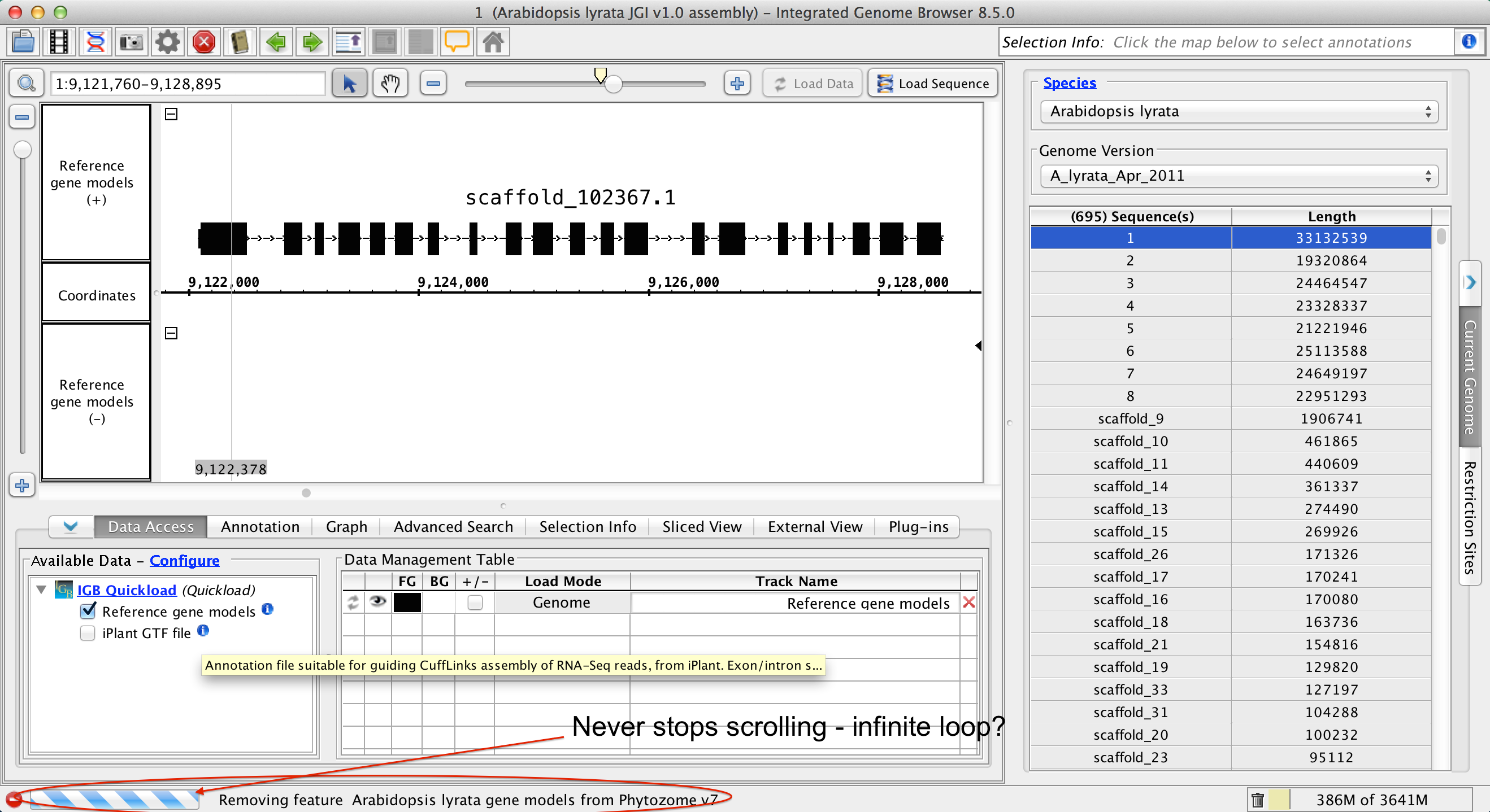 If I edit an annots.xml file, rename a data set by editing its "title" attribute, and then click the refresh icon in the Data Sources table under the "Data Sources" Preference tab, IGB removes the data set from the main view and replaces it with the new one, but then the message notifying me of the removal at the bottom left of the window never goes away. I noticed this when editing the title for the A lyrata reference genes.